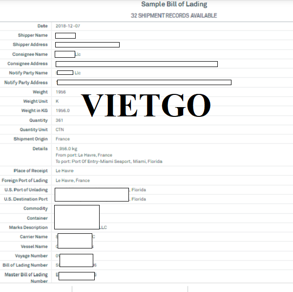Dưới đây là hình ảnh bản vận đơn nhập khẩu đồ uống từ Pháp sang Mỹ vào ngày 07/12/2018 mà công ty ông đã thực hiện thành công: