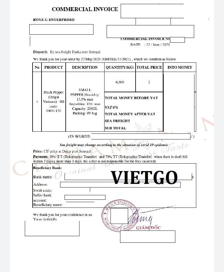 Hình ảnh hóa đơn thương mại nhập khẩu tiêu đen