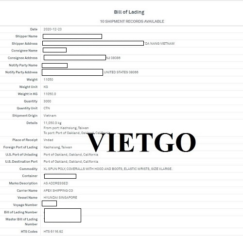 Dưới đây là vận đơn xuất khẩu sợi các loại của công ty sang thị trường Mỹ trong năm 2020: