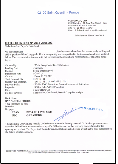 Thư xác nhận mua gạo trong đơn hàng đầu tiên