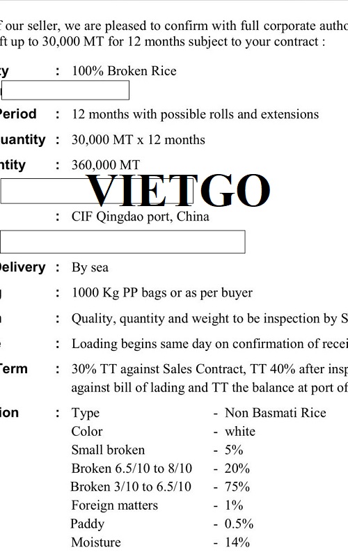 Ông Bryan – đại diện mua hàng của công ty ██████████ – đã liên hệ VIETGO với mong muốn tìm kiếm nhà cung cấp gạo cho đơn hàng thường xuyên của công ty tại thị trường Trung Quốc.