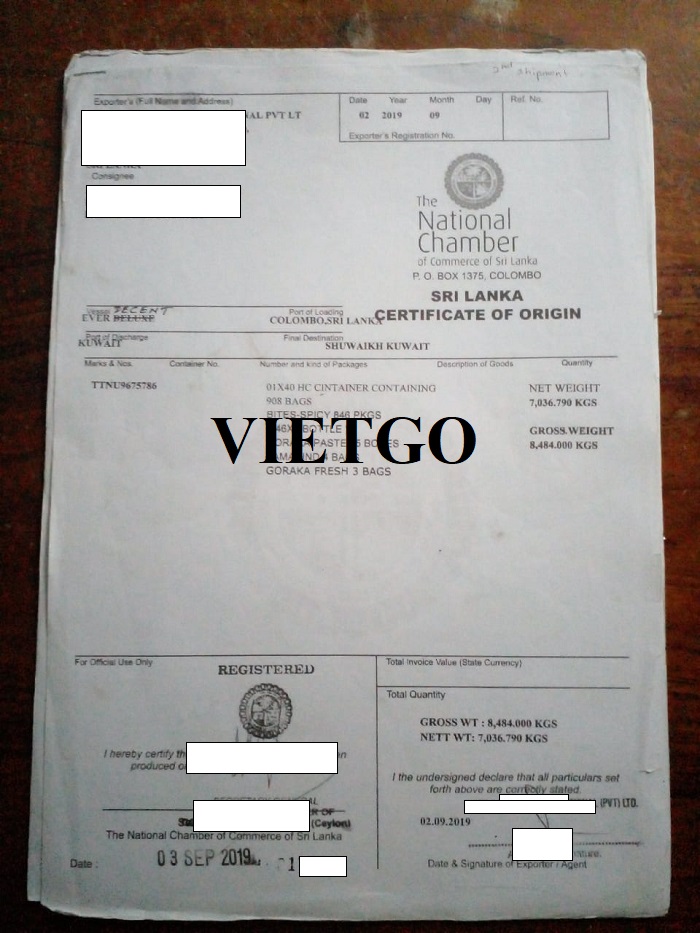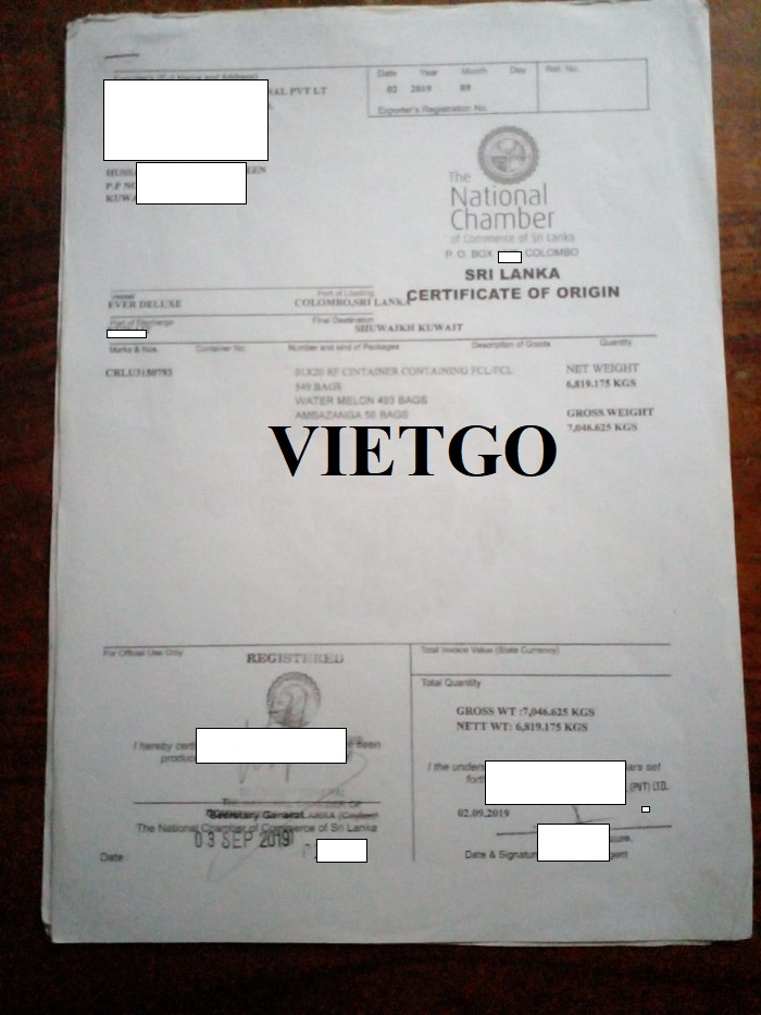 Hình ảnh giấy chứng nhận nguồn gốc xuất xứ từ Kuwait sang Sri Lanka vào năm 2019