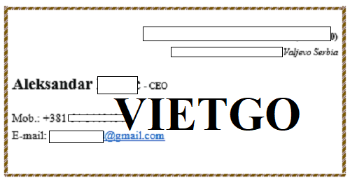 Nhờ cuộc trò chuyện và chia sẻ, VIETGO nhận thấy sự tiềm năng cũng như thiện chí hợp tác của vị khách hàng với các doanh nghiệp. Quý nhà cung cấp nào có thể đáp ứng được cho đơn hàng của ông Aleksandar, vui lòng liên hệ qua địa chỉ thông tin liên hệ được cung cấp dưới đây.
