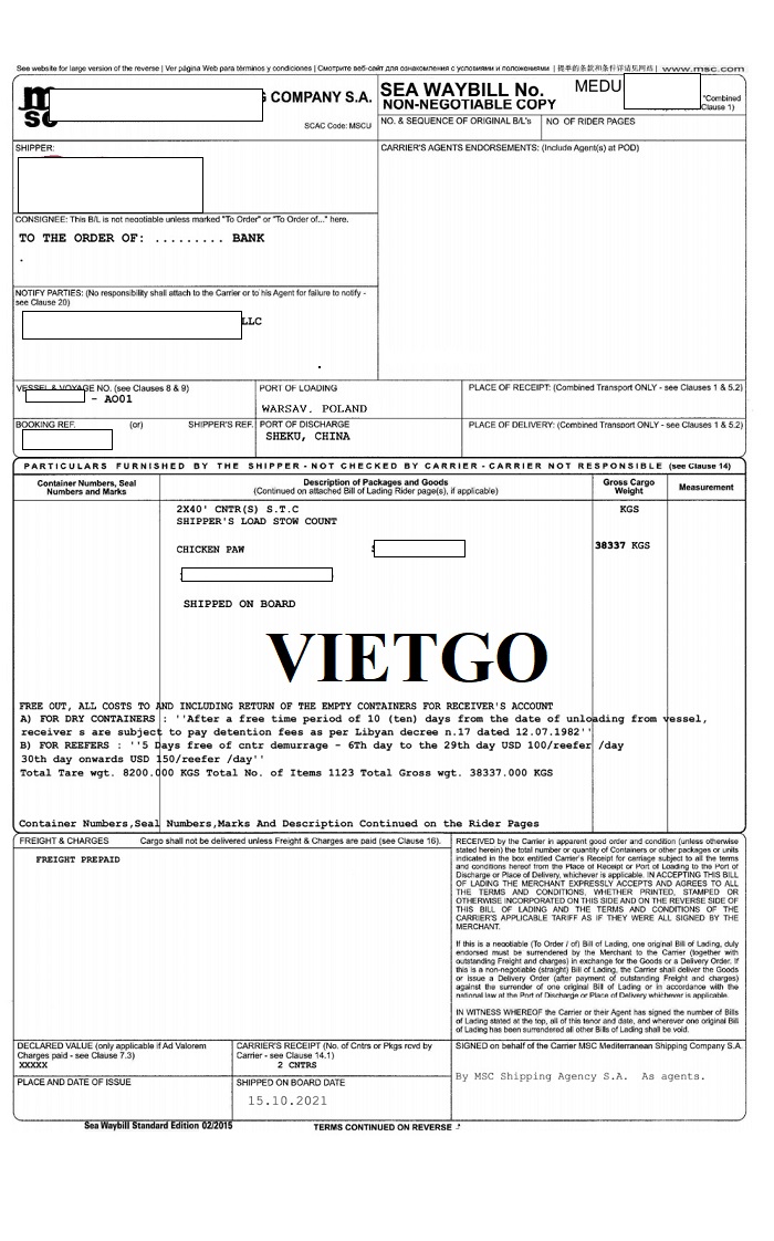 Dưới đây là hình ảnh bản vận đơn nhập khẩu chân gà từ Ba Lan vào Trung Quốc ngày 15/10/2021 của công ty do vị khách hàng đại diện:
