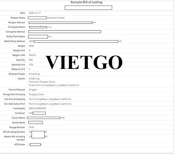 Dưới đây là một bản vận đơn của công ty ông Jacky, xuất khẩu sản phẩm áo len nam từ Trung Quốc đến Hoa Kỳ vào ngày 17/12/2020