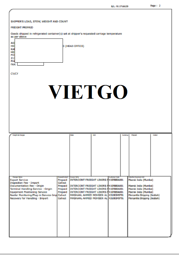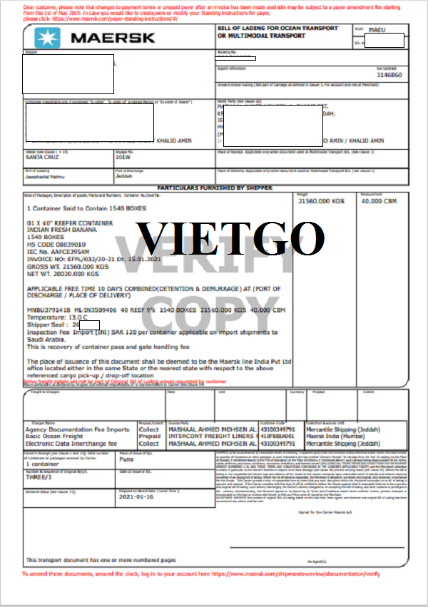 Dưới đây là một trong những bản vận đơn trong năm 2021 của công ty ██████████ Trading Est., tiến hành nhập khẩu chuối từ Ấn Độ vào Ả Rập Xê Út vào ngày 16/01/2021 cùng với phiếu đóng gói hàng hóa và giấy chứng nhận nguồn gốc của sản phẩm.
