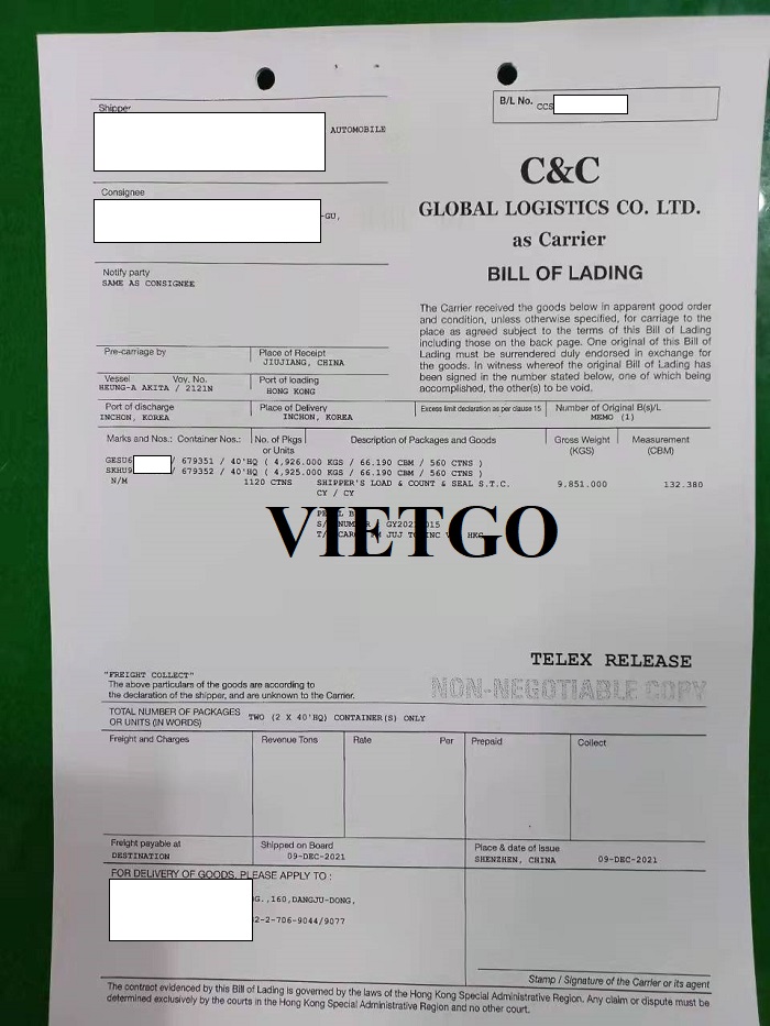 Hàn Quốc là một trong những thị trường quan trọng hàng đầu trong nhu cầu nhập khẩu gỗ và sản phẩm gỗ từ Việt Nam nói riêng và các quốc gia châu Á nói chung. Từ đầu năm 2020 đến 2021, nền kinh tế Hàn Quốc chịu thiệt hại nặng nề bởi dịch bệnh COVID-19, trong đó không ngoại trừ thị trường sản phẩm làm đẹp – thị trường chủ yếu của ██████████. Tuy nhiên, mặt hàng đồ nội thất và đồ gia dụng, đặc biệt là các sản phẩm từ gỗ lại có nhu cầu tiêu thụ tăng mạnh. Thích nghi với sự thay đổi này, ông quyết định mở rộng thị trường hoạt động của công ty mình, từ các sản phẩm làm đẹp và chăm sóc sức khỏe cho tới các mặt hàng gia dụng và nội thất gỗ. Ông Park chia sẻ rằng hiện công ty ông đang hợp tác với nhiều doanh nghiệp khác nhau tại châu Á để nhập khẩu các mặt hàng mới cho công ty của mình. Dưới đây là hình ảnh bản vận đơn nhập khẩu hàng hóa từ đối tác tại Trung Quốc vào ngày 09/12/2021 mà công ty ông đã thực hiện thành công.