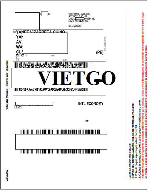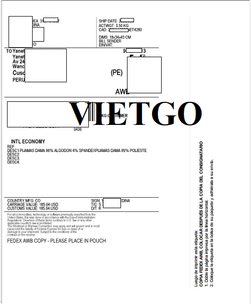 Hình ảnh hóa đơn vận chuyển của đơn hàng nhập khẩu quần áo từ Colombia của vị khách hàng
