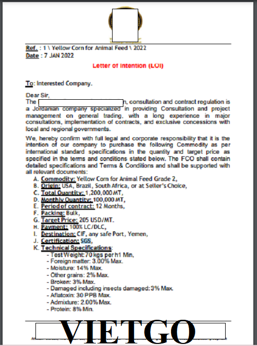 Hình ảnh thư Ý định của đơn hàng nhập khẩu ngô vàng do vị khách hàng cung cấp