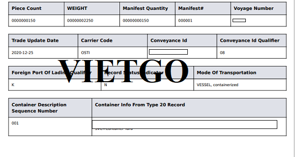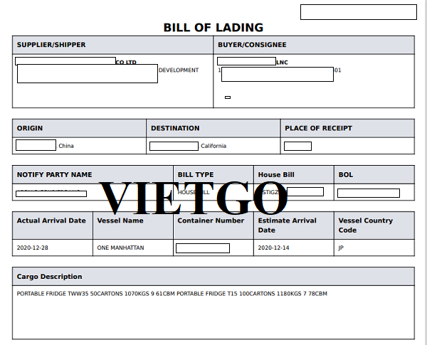 Hình ảnh bản vận đơn xuất khẩu tủ lạnh mini từ Trung Quốc sang Hoa Kỳ của công ty vị khách hàng vào ngày 28/12/2021