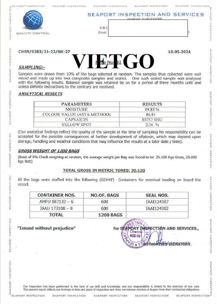 Hình ảnh Giấy giám định hàng hóa của đơn hàng nhập khẩu ớt khô của công ty vị khách hàng vào ngày 05/10/2021