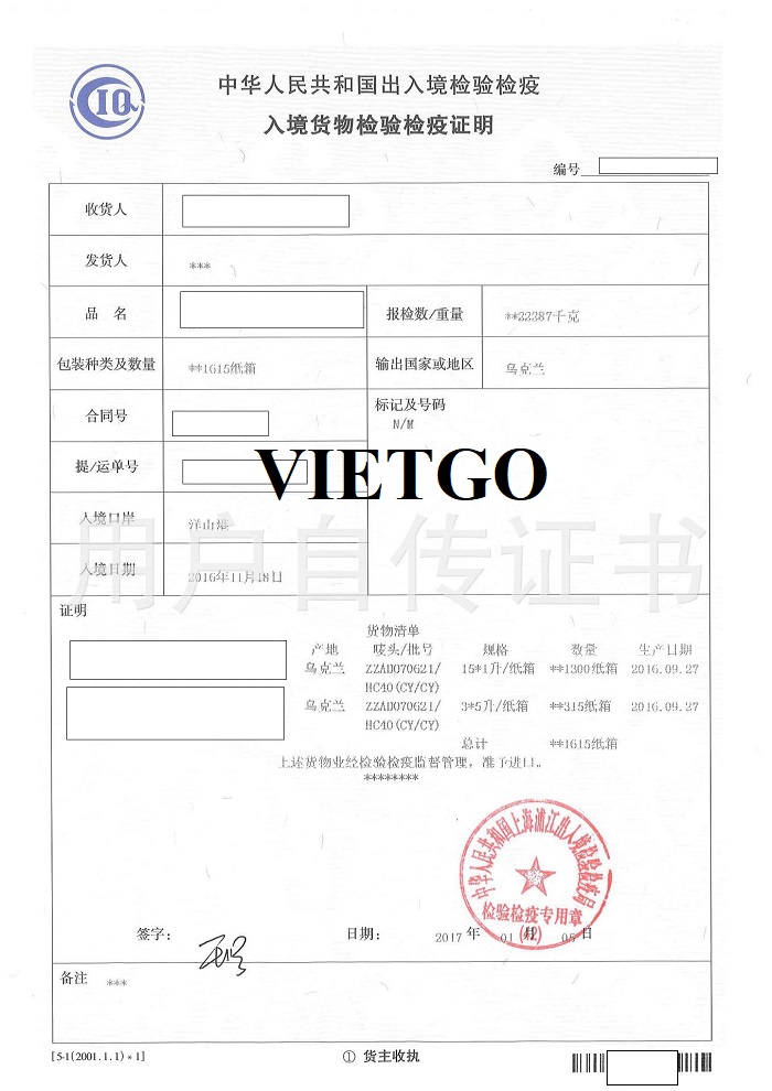 Hình ảnh Giấy kiểm dịch hàng hóa nhập khẩu của công ty vị khách hàng