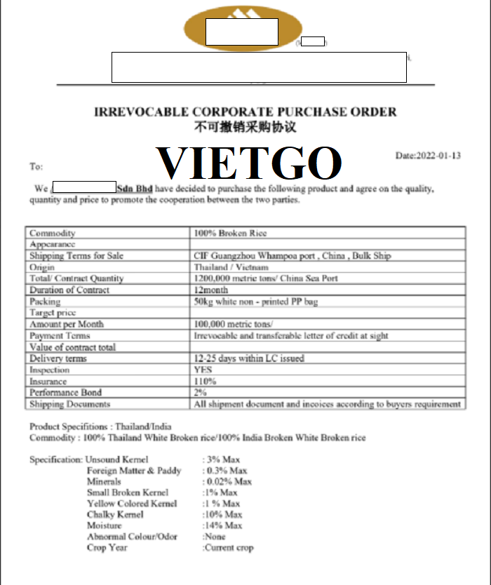 VIETGO xin gửi tới Quý nhà cung cấp thông tin về đơn hàng gạo tấm đến từ vị khách hàng người Malaysia, anh Stephen.