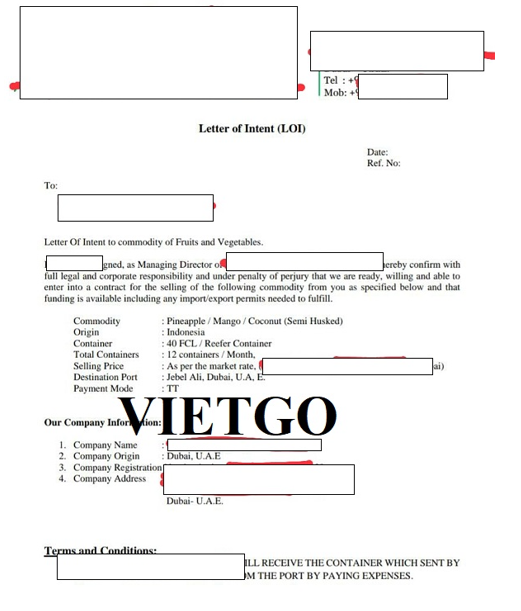Thư Ý định cho đơn hàng nhập khẩu sản phẩm rau củ thời gian vừa qua do vị khách hàng cung cấp