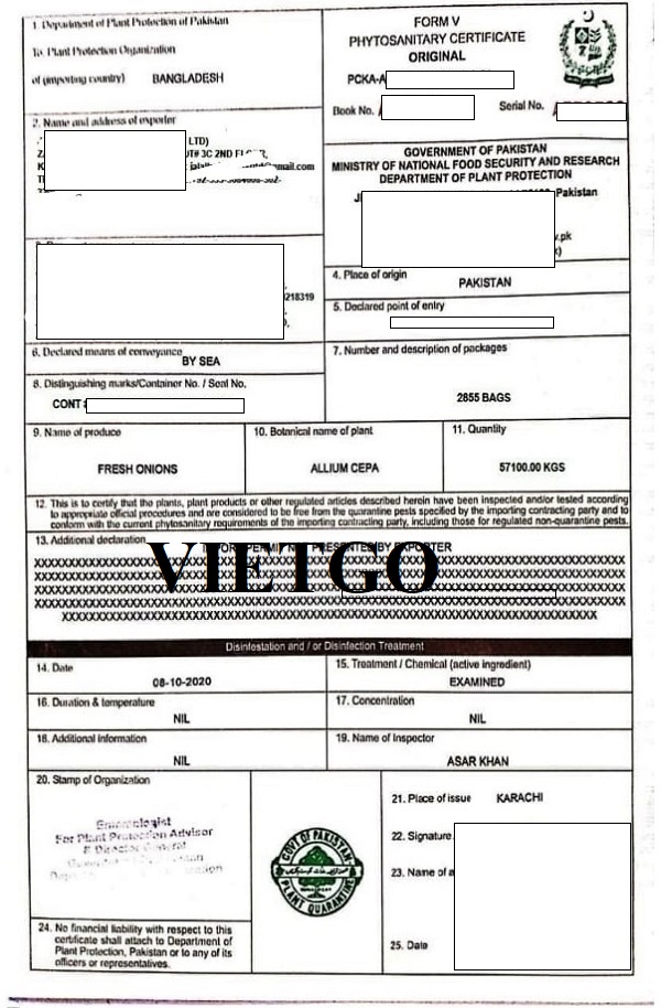 Hình ảnh chứng nhận kiểm dịch thực vật của sản phẩm hành tím của công ty vị khách hàng