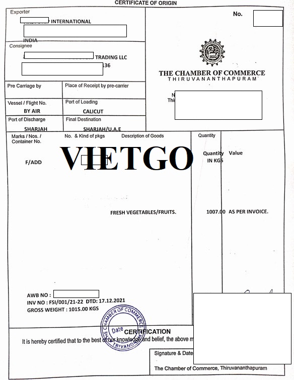 Dưới đây là vận đơn hàng không, phiếu đóng gói hàng hóa, hóa đơn thanh toán và giấy chứng nhận xuất xứ hàng hóa của đơn hàng nhập khẩu rau tươi từ Ấn Độ vào UAE của vị khách hàng ngày 20/12/2021: