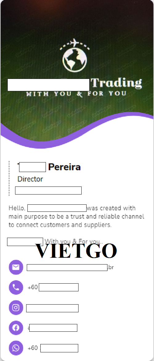 Hiện ông Pereira đang sinh sống và làm việc tại Malaysia. Tại đây ông thành lập một công ty thương mại có tên là ██████████BUY TRADING. Với lượng khách hàng chính đến từ Brazil, ông Pereira cam kết cung cấp tới khách hàng của mình hầu hết các loại sản phẩm từ dệt may tới thiết bị y tế. Các mặt hàng chính anh chủ yếu giao dịch bao gồm: khẩu trang, găng tay y tế các loại, máy đo nhiệt độ, bộ test nhanh Covid, các loại áo phông, áo polo và phụ kiện thời trang khác. Với mục tiêu mở rộng mạng lưới khách hàng từ Brazil tới các quốc gia khác trong khu vực châu Mỹ như Argentina và Colombia, ông Pereira đang đầu tư thời gian và công sức vào việc tìm kiếm và hợp tác những nhà cung cấp uy tín tại khu vực châu Á.