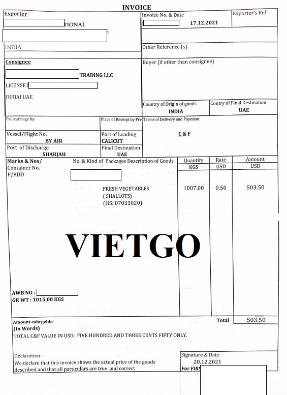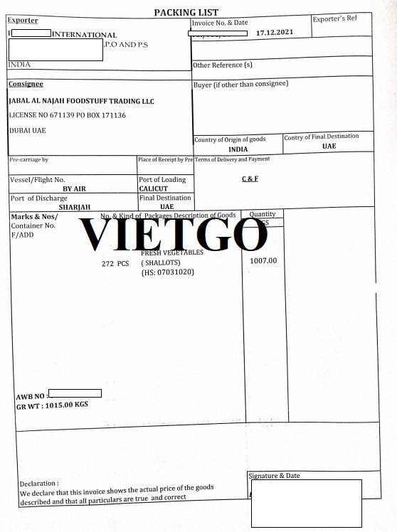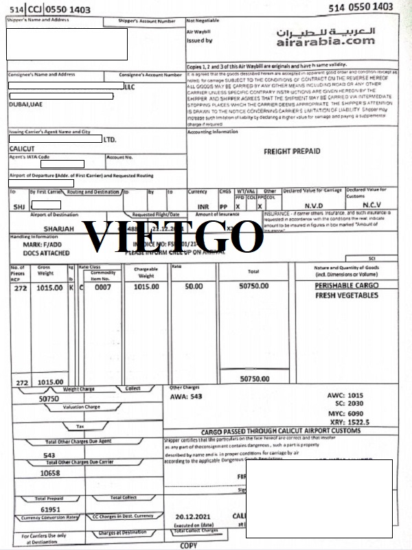 Dưới đây là vận đơn hàng không, phiếu đóng gói hàng hóa, hóa đơn thanh toán và giấy chứng nhận xuất xứ hàng hóa của đơn hàng nhập khẩu rau tươi từ Ấn Độ vào UAE của vị khách hàng ngày 20/12/2021: