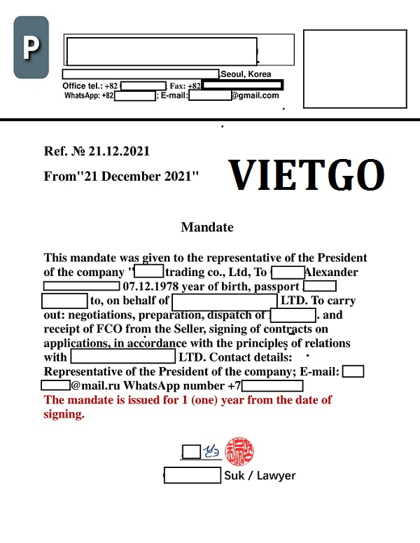 Hình ảnh giấy ủy nhiệm cho ông Alexander đại diện cho chủ tịch công ty ██████████