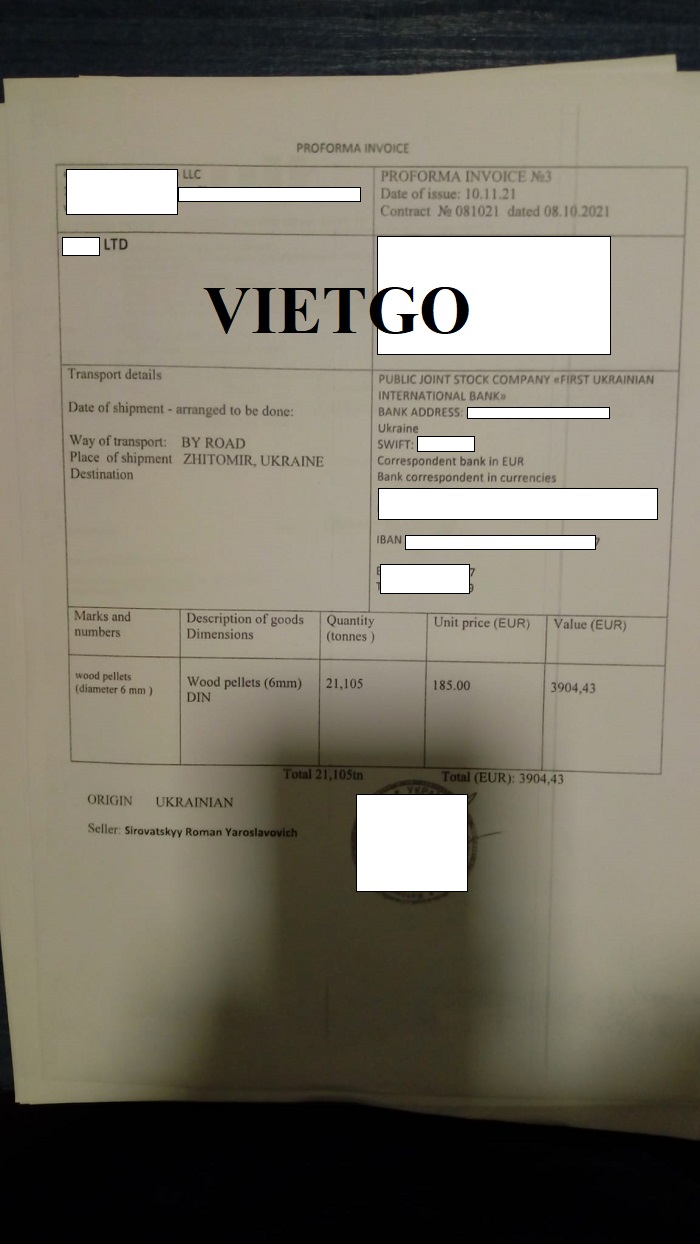 Hình ảnh hóa đơn chiếu lệ của chuyến hàng nhập khẩu viên nén mùn cưa từ Ukraine
