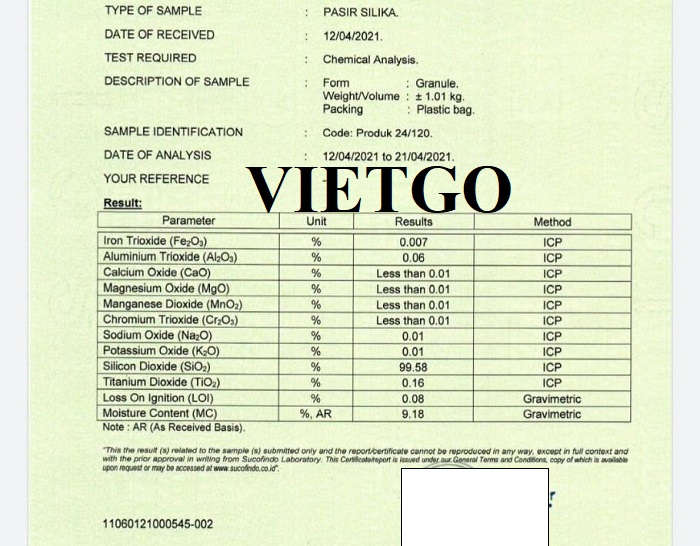 Trao đổi về đơn hàng, vị khách hàng cho biết: “Hiện tại, chúng tôi đang có nhu cầu nhập khẩu 200,000 tấn cát silica cho một doanh nghiệp xây dựng. Đối với đơn hàng này, chúng tôi mong muốn sẽ tìm được nhà cung cấp phù hợp, có chất lượng tốt và giá cả cạnh tranh. Liên hệ với VIETGO, tôi hi vọng sẽ có cơ hội hợp tác với những nhà cung cấp tiềm năng tại đây. Nếu đơn hàng này thành công, chúng tôi sẽ ký hợp đồng dài hạn và nhập khẩu với số lượng lớn hơn”.
