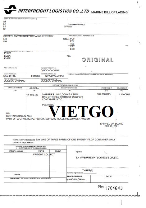 Là một doanh nghiệp lâu năm, anh Ivan thường xuyên phải đi gặp gỡ đối tác, tìm hiểu và trau dồi kinh nghiệm, kiến thức sản phẩm của mình và nâng cấp máy móc thiết bị. Anh thường xuyên phải gặp gỡ đối tác, kỹ kết hợp đồng và nhập khẩu hàng hóa ở nhiều quốc gia để phục vụ cho quá trình sản xuất được đúng tiến độ. Dưới đây là bản vận đơn anh nhập khẩu thành công sản phẩm ống nhựa dẫn khí từ cảng Thanh Đảo, Trung Quốc đến cảng Odessa, Ukraine: