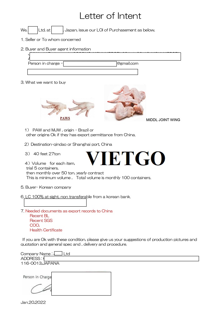 Vừa qua, VIETGO nhận được liên hệ từ ông Choi, Giám đốc của công ty ██████████ Ltd cho đơn hàng nhập khẩu hàng tháng chân gà và cánh gà sang thị trường Trung Quốc. Vị khách hàng đã gửi thông tin chi tiết đơn hàng và mong muốn được kết nối với các nhà cung cấp tại đây.