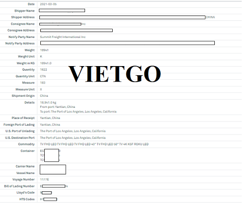 Hình ảnh thông tin vận đơn xuất khẩu ti vi LED full HD sang Mỹ được công ty vị khách hàng thực hiện thành công vào năm 2021