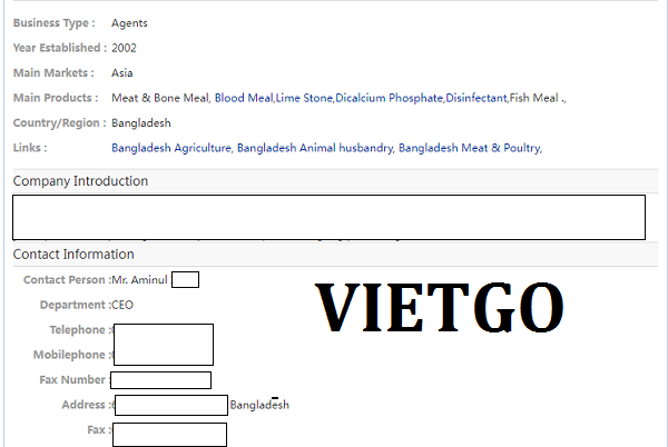 Vào năm 2005, ông Aminul chính thức thành lập công ty ██████████ chuyên kinh doanh và xuất khẩu thịt & bột xương, hóa chất Dicalcium phosphate, nấm tươi, nấm bột, khoai tây tươi loại một, lá trầu không, đay thô, các sản phẩm từ đay. Kể từ năm 2004, ông Aminul đã cung cấp các sản phẩm dinh dưỡng cho chim, cá và dinh dưỡng động vật trước khi chính thức thành lập ty ██████████ vào năm 2005. Công ty ông là một trong những đơn vị hàng đầu tại Bangladesh hoạt động trong lĩnh vực nông nghiệp, chăn nuôi gia súc, thịt & gia cầm. Hiện tại, công ty ông phải thường xuyên nhập khẩu các sản phẩm như ngô, cám lúa mì, bột gluten ngô, ddgs, bột đá, bột cá sấy khô, dầu cá… từ nước ngoài. Ông Aminul cho biết công ty ông thường nhập khẩu trực tiếp để phục vụ nhu cầu sản xuất cũng như bán lại cho các nhà phân phối khác tại Bangladesh. Doanh thu hàng năm của công ty hiện nay rơi vào khoảng từ 15 đến 25 triệu USD.