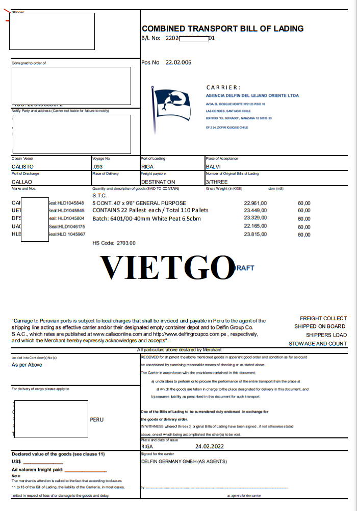 Về cá nhân, ông Daniel là một vị khách hàng lịch sự và nhiệt tình trong công việc. Ông vừa tốt nghiệp ngành Kỹ sư nông nghiệp lại vừa sở hữu bằng thạc sĩ ngành Quản trị kinh doanh. Ông đã tham gia quản lý và vận hành nhiều dự án nông nghiệp trên toàn quốc cũng như thường xuyên giao lưu với các đối tác tại những hội chợ, sự kiện trong ngành. Ông luôn thể hiện khả năng lãnh đạo xuất sắc, tinh thần đổi mới, sáng tạo và kỹ năng xử lý tình huống khéo léo để mang đến hiệu quả cao nhất trong công việc kinh doanh. Ông mong sẽ có cơ hội tiếp cận với nguồn nông sản chất lượng cao có nguồn gốc từ châu Á thông qua dịch vụ của VIETGO. Dưới đây là bản Vận đơn cho chuyến hàng nhập khẩu 5 container 40ft rêu than bùn trắng (white peat) từ Latvia đến Peru của công ty vị khách hàng: