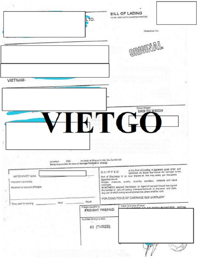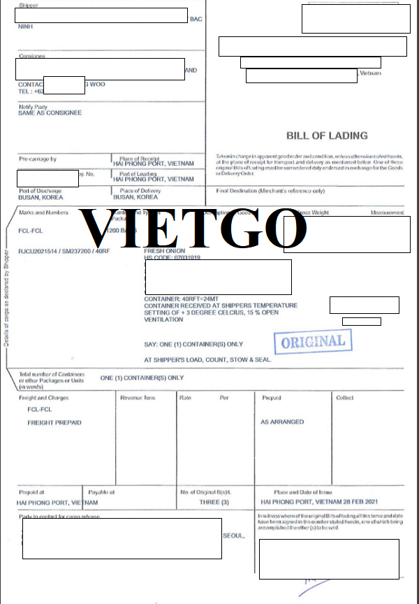 Hình ảnh vận đơn đường biển cho sản phẩm hành từ Viêt Nam tới Hàn Quốc do công ty vị khách hàng đại diện