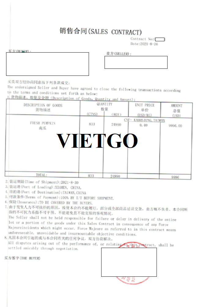 Hình ảnh hợp đồng mua bán sản phẩm bí đỏ của công ty vị khách hàng
