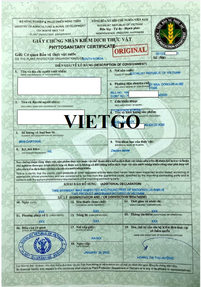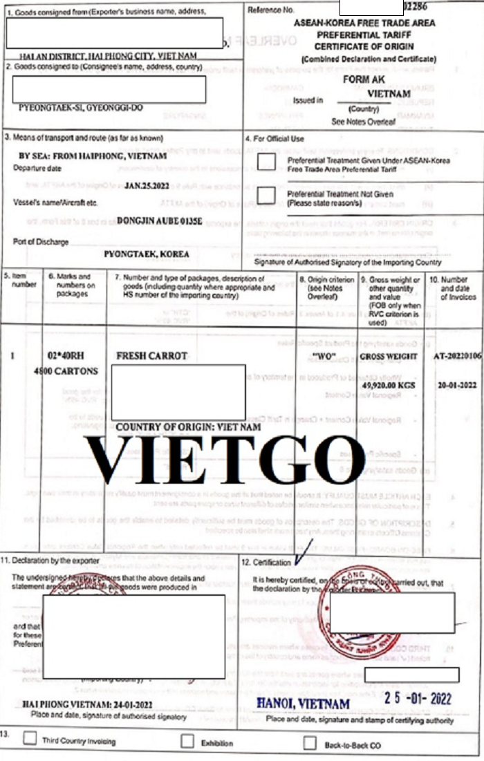Dưới đây là vận đơn đường biển, nguồn gốc xuất xứ và giấy chứng nhận kiểm định sản phẩm cà rốt và hành xuất khẩu từ Việt Nam sang Hàn Quốc ngày 25/01/2022 và ngày 28/02/2021 của công ty do vị khách hàng đại diện: