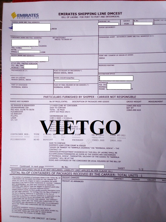 Hình ảnh vận đơn nhập khẩu tấm lót từ Ấn Độ sang Kenya