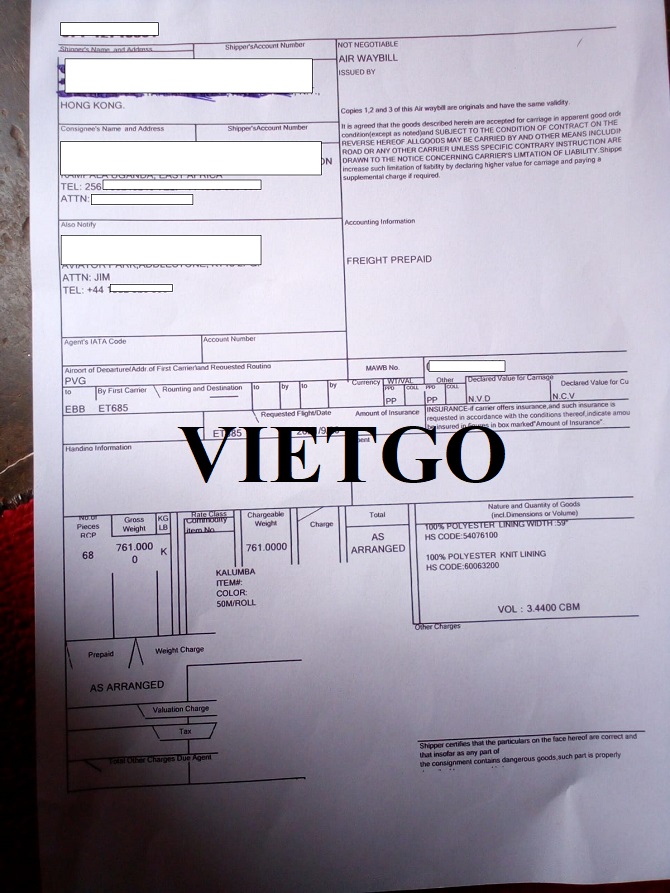 Hình ảnh vận đơn nhập khẩu vải lót polyester từ Hong Kong sang Đông Phi ngày 29/09/2021