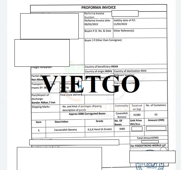 Hình ảnh hóa đơn chiếu lệ cho đơn hàng nhập khẩu chuối Cavendish từ Ấn Độ tới Iran của công ty vị khách hàng