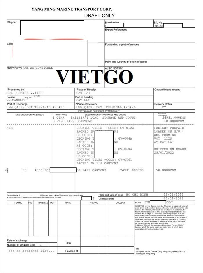 Dưới đây là bản vận đơn của chuyến hàng xuất khẩu vỉ ván sàn sang Iraq mà công ty vị khách hàng đã thực hiện thành công vào ngày 25 tháng 01 năm 2022: