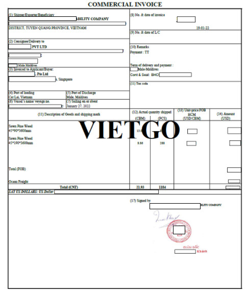 Hình ảnh một số chứng từ nhập khẩu của công ty vị khách hàng đối với đơn hàng nhập khẩu gỗ thông xẻ từ Việt Nam, được thực hiện thành công vào tháng 01 năm 2022