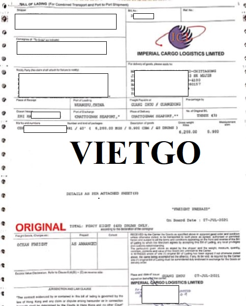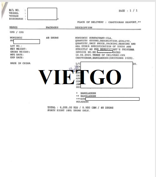 Dưới đây là bản vận đơn nhập khẩu mặt hàng chất tẩy rửa từ Trung Quốc sang Bangladesh mà công ty ông đã thực hiện thành công vào ngày 07/07/2021: