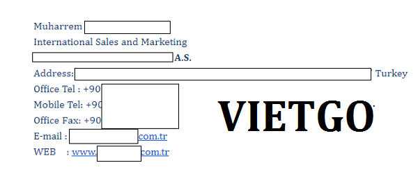 VIETGO xin gửi tới Quý nhà cung cấp về thông tin đơn hàng. Ông Muharrem rất mong sẽ nhanh chóng nhận được liên hệ của các nhà cung cấp với sự giới thiệu của VIETGO. Ông luôn thể hiện sự nhiệt tình và nghiêm túc với đơn hàng trong suốt quá trình trao đổi. Quý nhà cung cấp quan tâm đến đơn hàng trên, vui lòng liên hệ ngay cho ông theo địa chỉ liên lạc bên dưới.