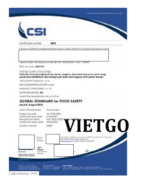 Hiện nay, ██████████ ██████████ đã hoàn thành đăng ký BRC 7, IFS, chứng nhận tuân thủ hữu cơ và xã hội và đảm bảo chất lượng ISO 9001, FSSC 22000.