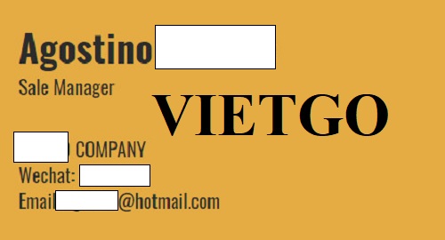 Qua cuộc trò chuyện, VIETGO nhận thấy ông Agostino là vị khách hàng nghiêm túc, có thái độ làm việc chuyên nghiệp. Quý nhà cung cấp nào có thể đáp ứng được đơn hàng của ông Agostino vui lòng liên hệ và báo giá cho ông trong thời gian sớm nhất theo thông tin dưới đây: