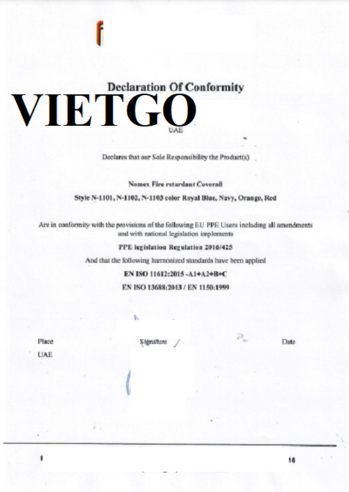 Hình ảnh giấy Tuyên bố tuân thủ cho sản phẩm đồ bảo hộ lao động của công ty