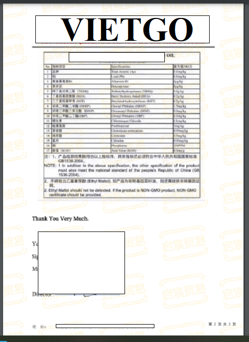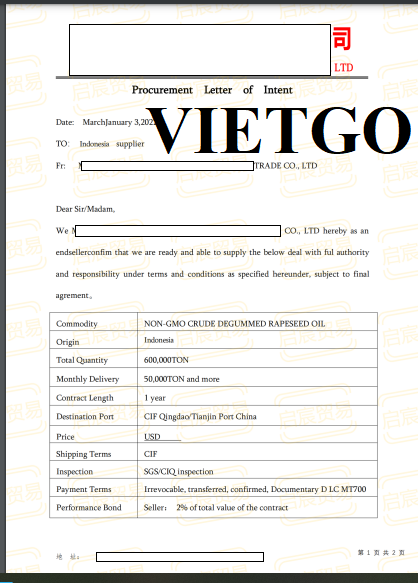Hình ảnh thư Ý định cho đơn hàng nhập khẩu dầu hạt cải do vị khách hàng cung cấp