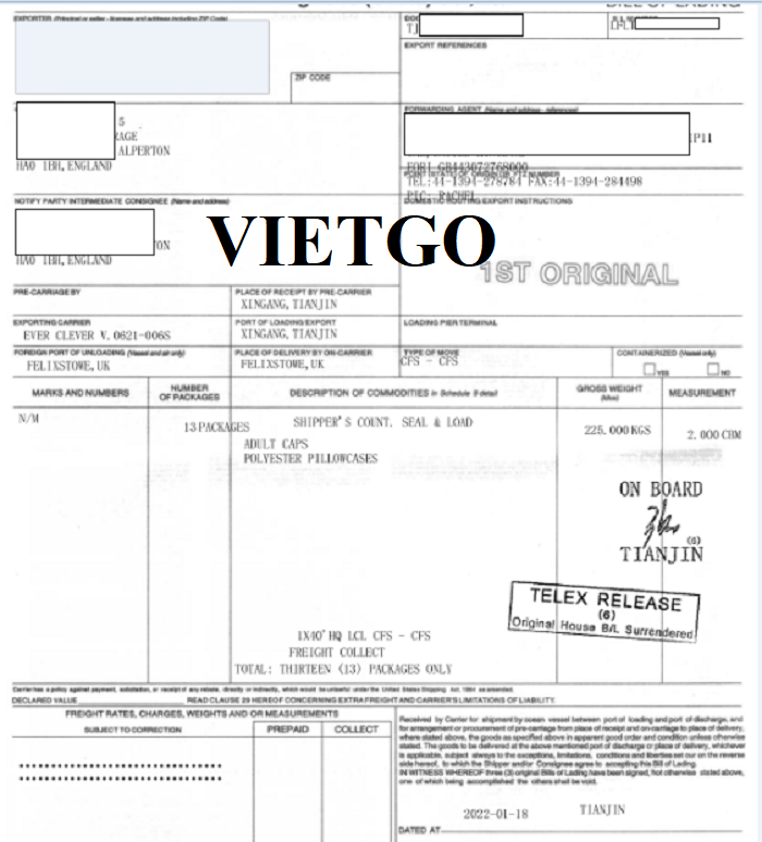Dưới đây là hình ảnh bản vận đơn nhập khẩu mũ lưỡi trai và vỏ gối từ Trung Quốc sang Anh ngày 18/1/2022 mà công ty vị khách hàng đã thực hiện thành công: