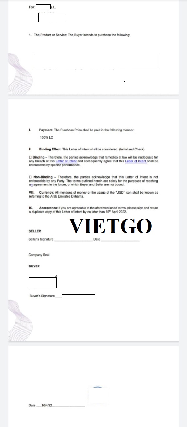 Hình ảnh thư Ý định cho đơn hàng nhập khẩu gạo trắng đến từ đối tác tại Cuba của vị khách hàng