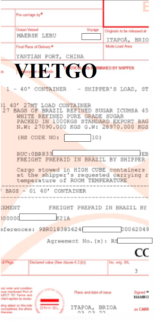 Hình ảnh vận đơn nhập khẩu dầu thực vật từ Trung Quốc tới Đức của công ty vị khách hàng đại diện