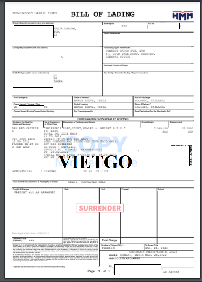 Dưới đây là hình ảnh bản vận đơn xuất khẩu ớt khô từ Ấn Độ sang Srilanka vào ngày 28/03/2022 mà công ty vị khách hàng đã tiến hành thành công: