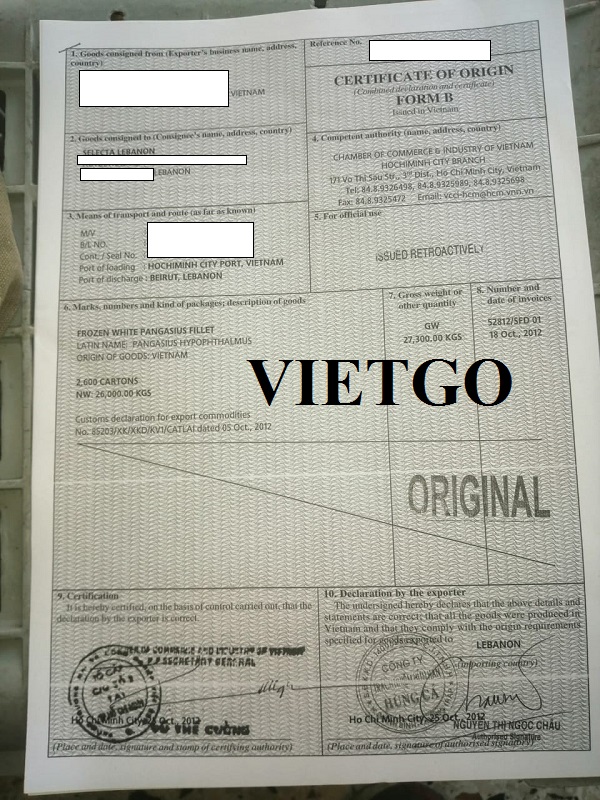 Hình ảnh Giấy chứng nhận nguồn gốc xuất xứ cho chuyến hàng nhập khẩu của công ty vị khách hàng