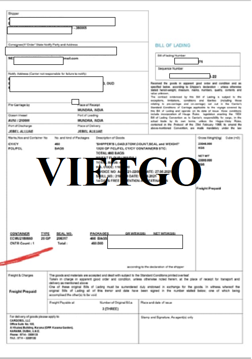 Hình ảnh bản vận đơn nhập khẩu bột mì từ Ấn Độ đến Dubai của công ty do vị khách hàng đại diện